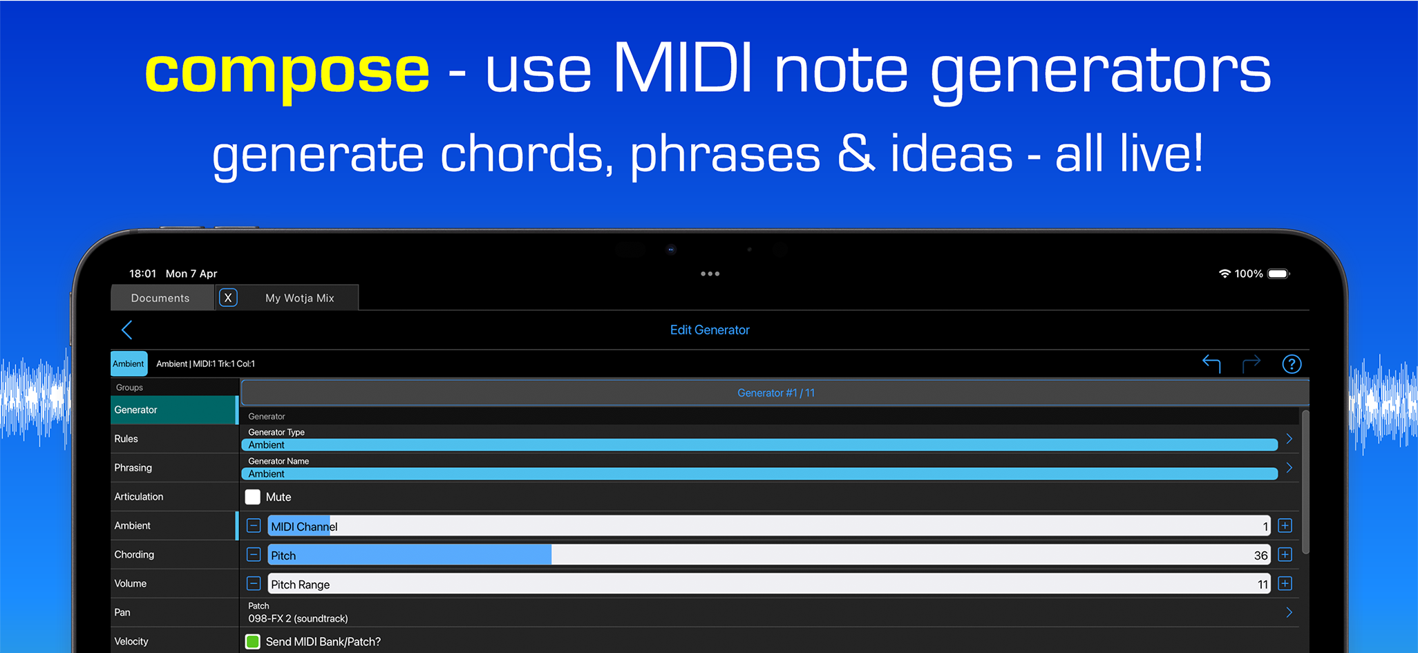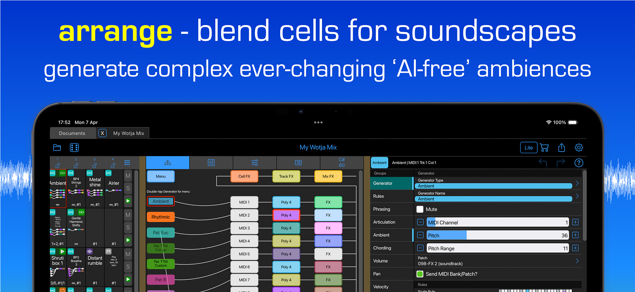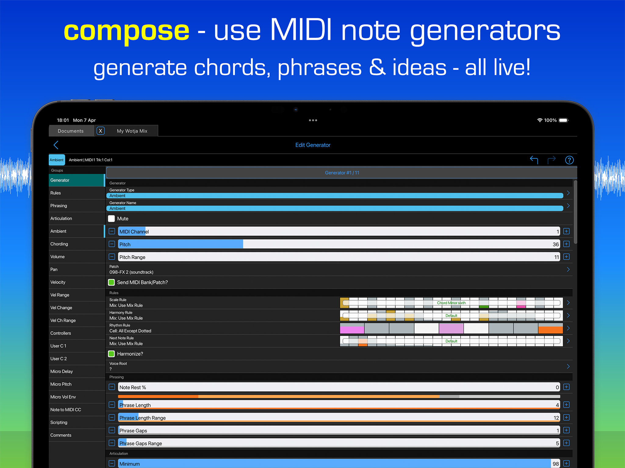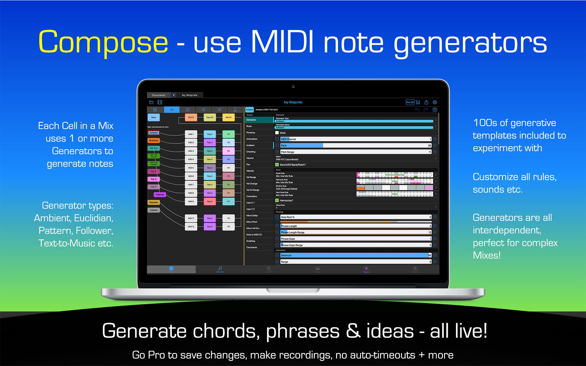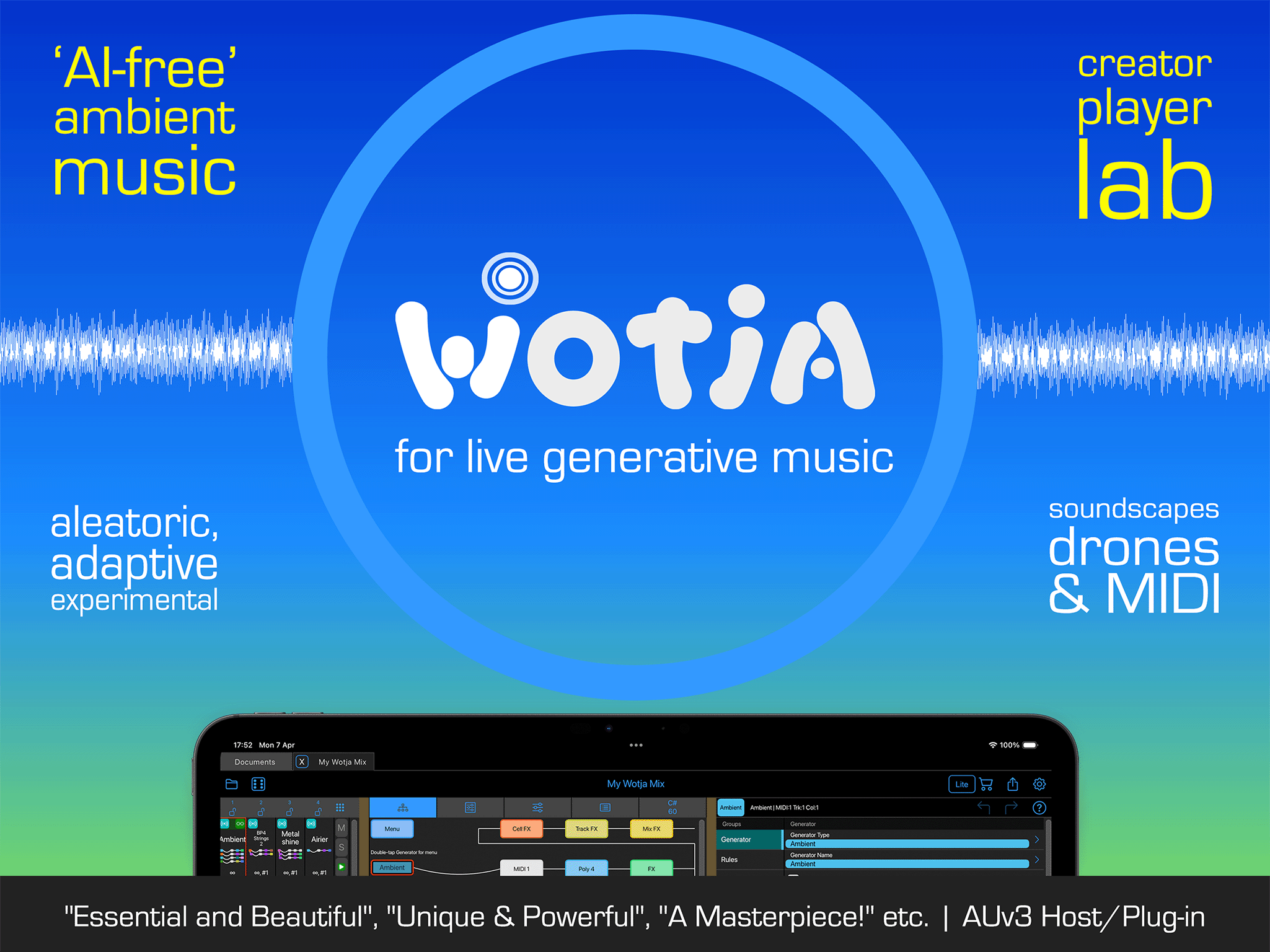 You can also use as broad a sound palette as you like because the Wotja Music Engine generates MIDI. This can be rendered via the Wotja Audio Engine and/or used (via MIDI out) to drive other 3rd Party sound units, e.g. AUv3/AUv2 or VST3 Plug-ins etc.