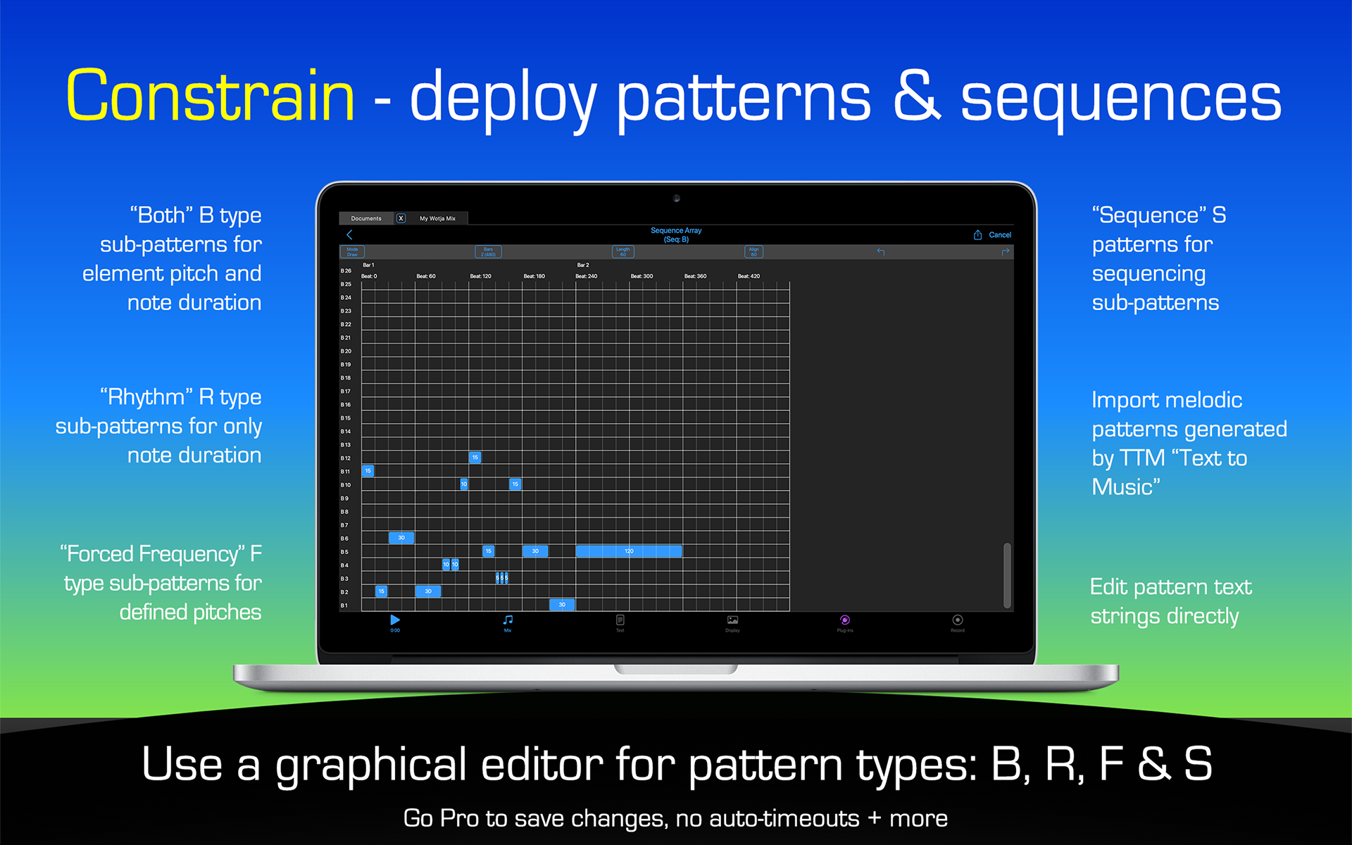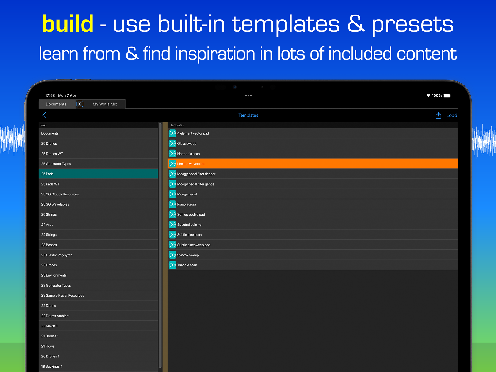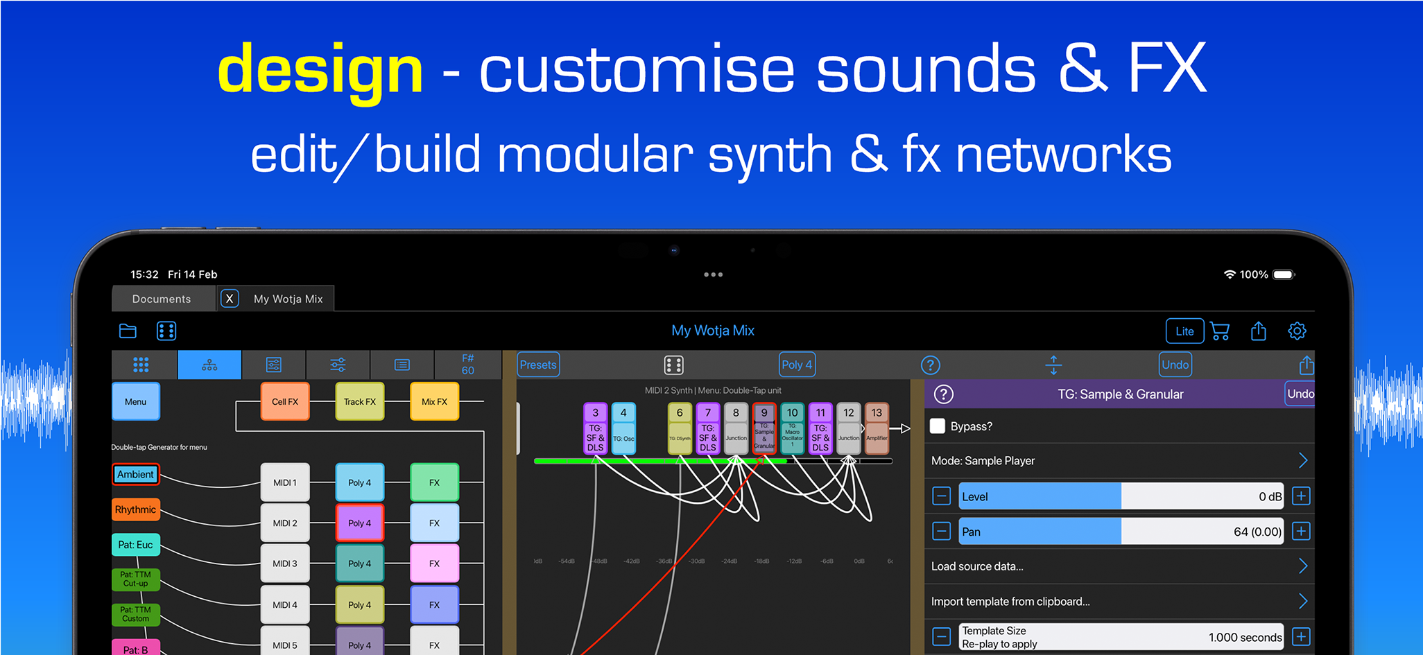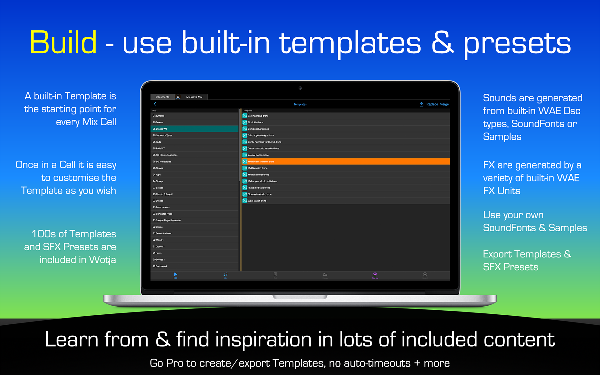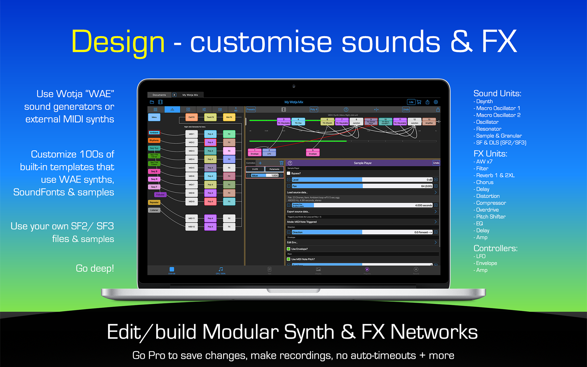 You can also use as broad a sound palette as you like because the Wotja Music Engine generates MIDI. This can be rendered via the Wotja Audio Engine and/or used (via MIDI out) to drive other 3rd Party sound units, e.g. AUv3/AUv2 or VST3 Plug-ins etc.