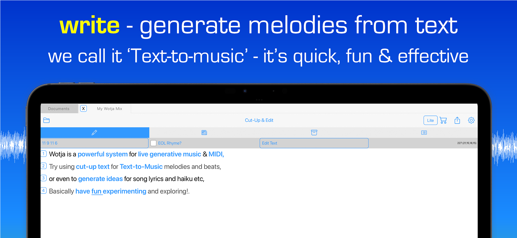Use it to easily create & play on-device generated ambient music soundscapes, textured drones, text to music melodies & arps, experimental & adaptive music + idea generation + music for sleep, relaxation & reflection etc.