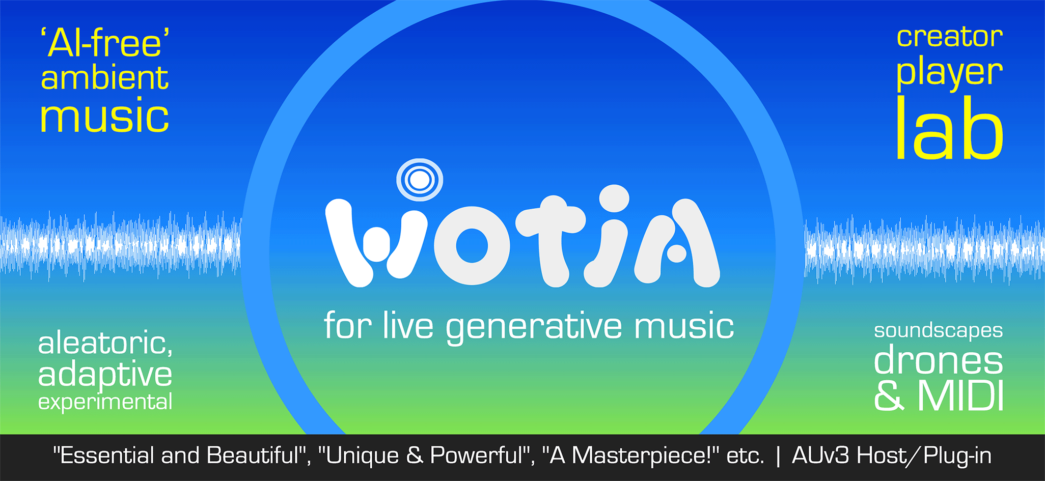 Wotja can also be used for free to explore Live Generative Music, a fascinating art form in its own right. Wotja Music is not AI music.