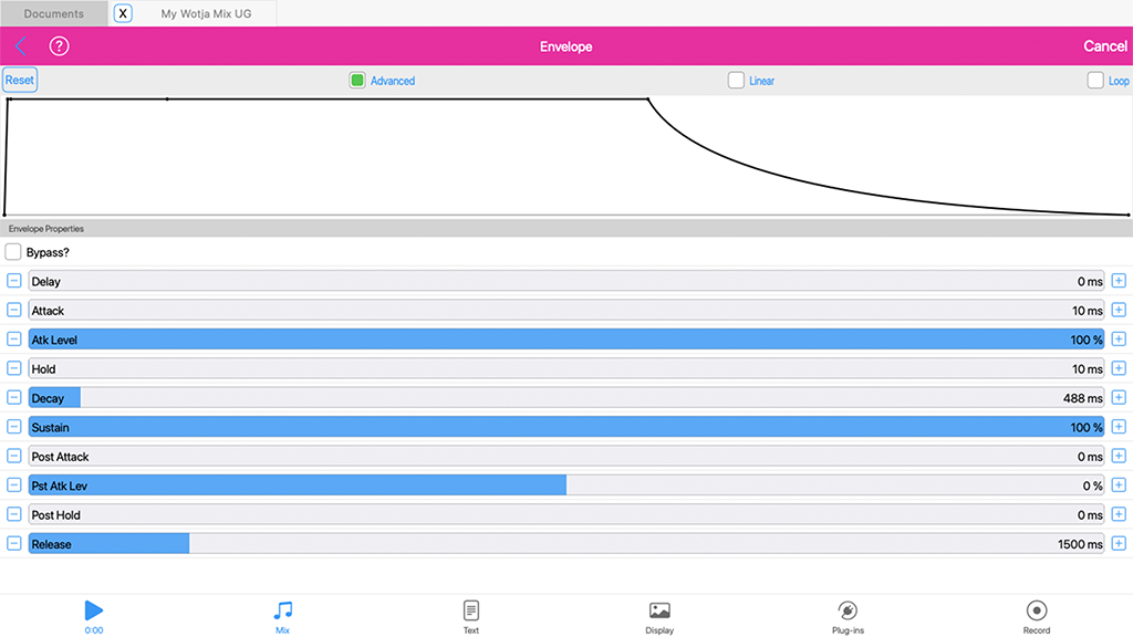 - Pst Atk Level (Advanced): The target level for the post-attack stage of the envelope, as the envelope moves from its sustain level.