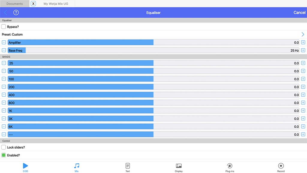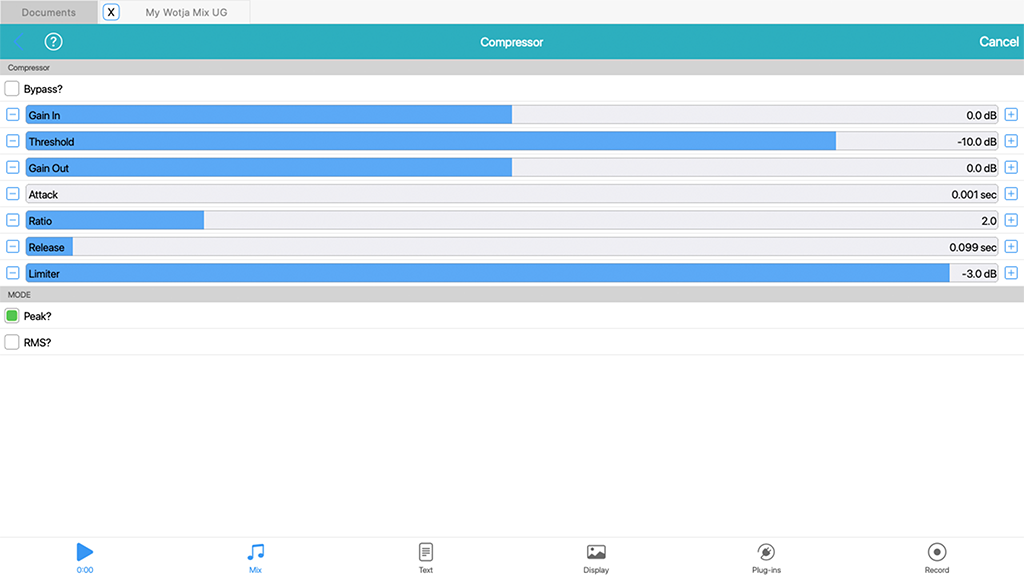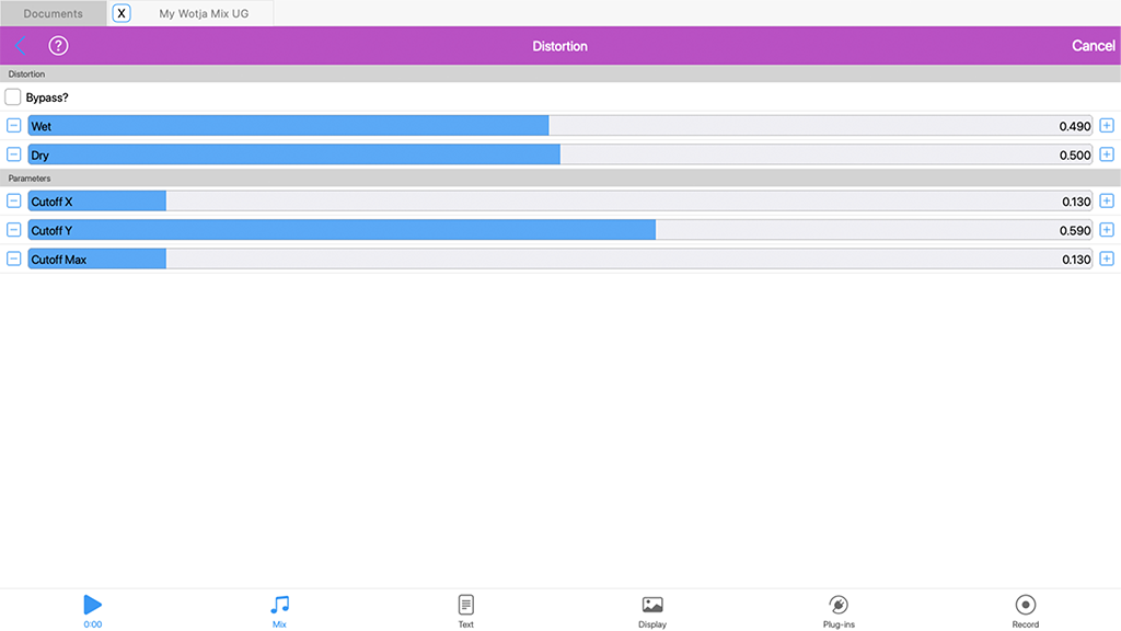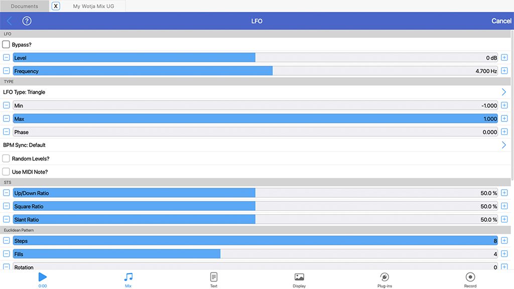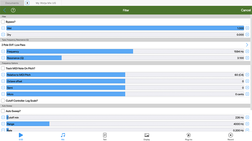 Once you've done all that, tap unit 5 (the filter) to open the Filter Unit. Set the filter type to "low pass" and adjust the cutoff frequency and Q (resonance) to taste. The filter will automatically sweep unless you tell it otherwise.