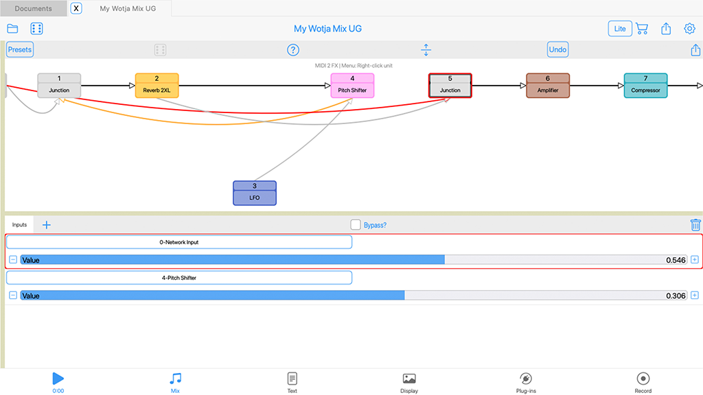Tap/hold Unit 4 (the Filter) and press the "Add Before" button and then select a "Junction"; your Filter is now moved to become unit 5! When the Junction Unit is selected, in the bottom Connector & Controllers area tap the Add button twice. Make sure that the first input item of the two inputs you've just added comes from Unit 2 (the first tone generator), and make sure that the second of the two inputs comes from Unit 3 (the second tone generator). You can set relative scaling factors for the two input units by playing with the scaling factors.