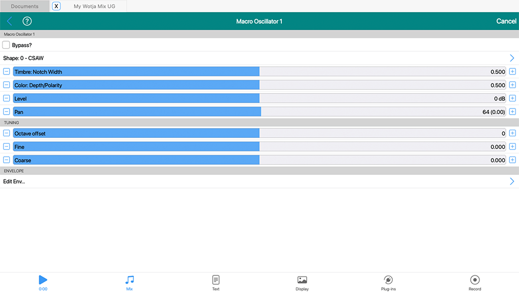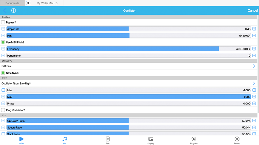 Tap unit 2 to display the Oscillator Unit. There is a list control where you can select the wave shape for this tone generator. We want a saw wave. The direction of the slope isn't relevant. Close unit 2, then tap unit 3 to display the second Oscillator Unit.