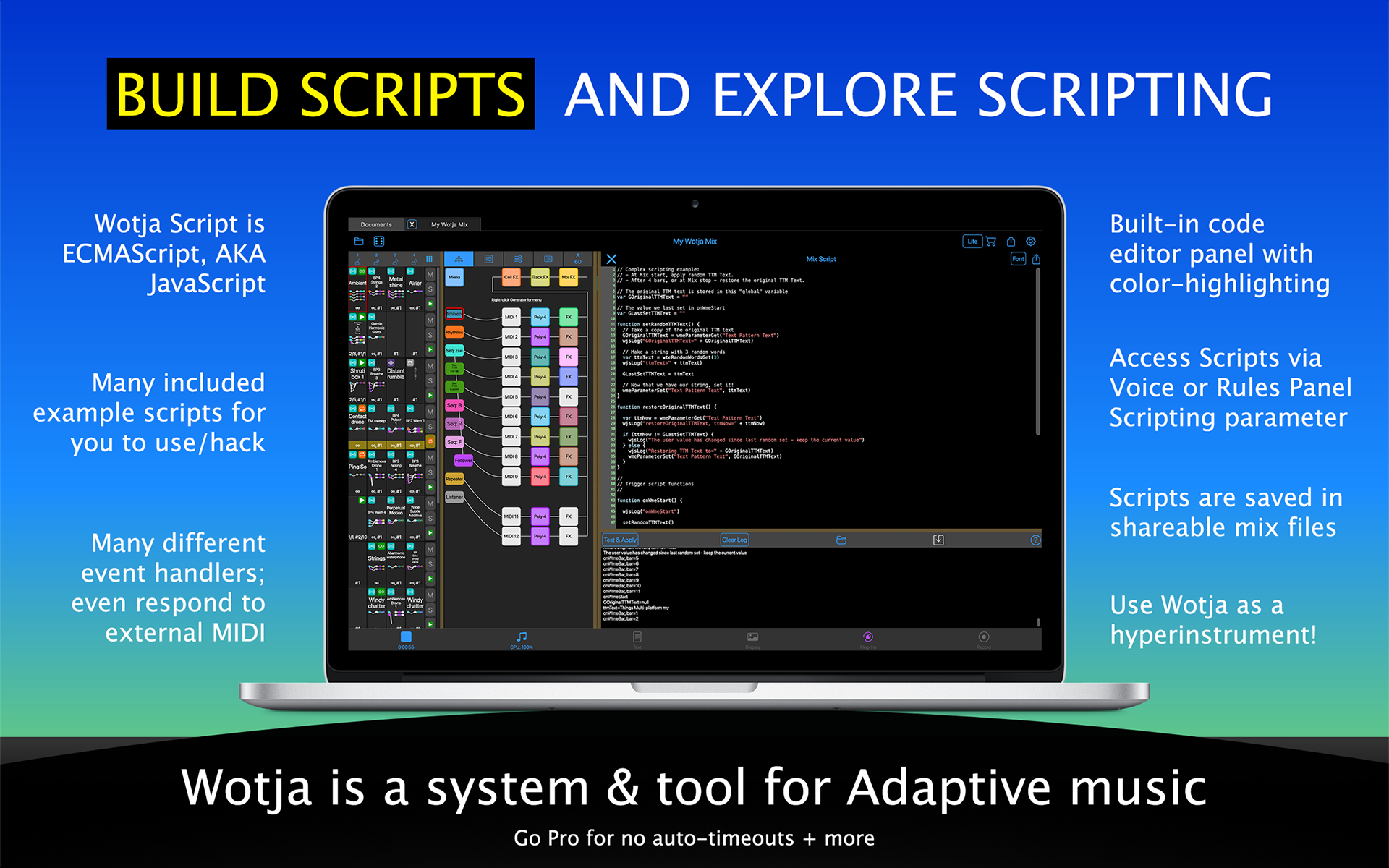 The Wotja Music Engine is a powerful, flexible and deep "adaptive" generative music engine. It utilises a range of generative / aleatoric / stochastic / algorithmic music techniques and parameters to create MIDI notes and MIDI controller events.