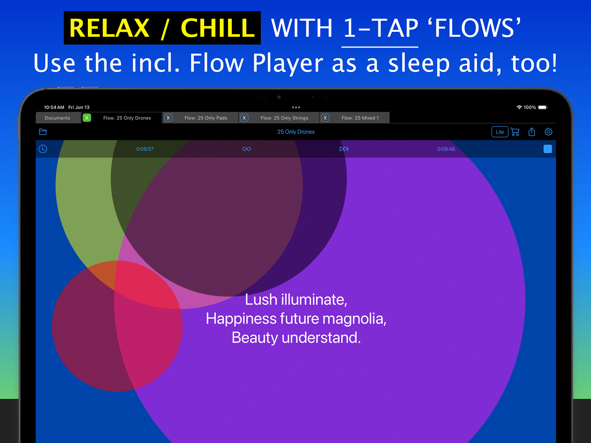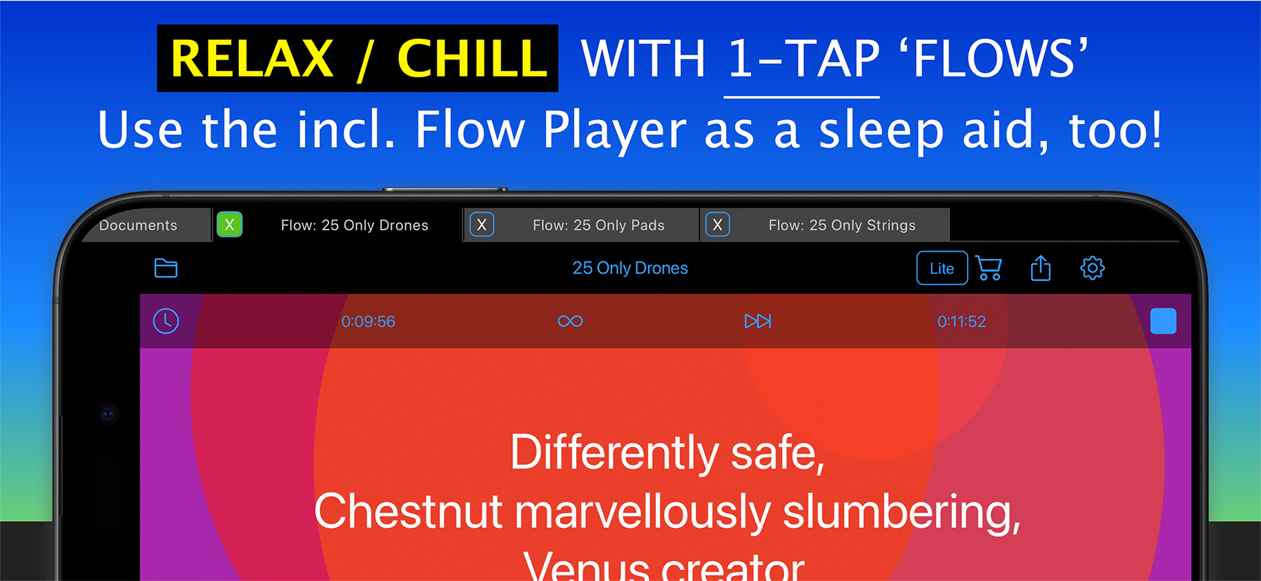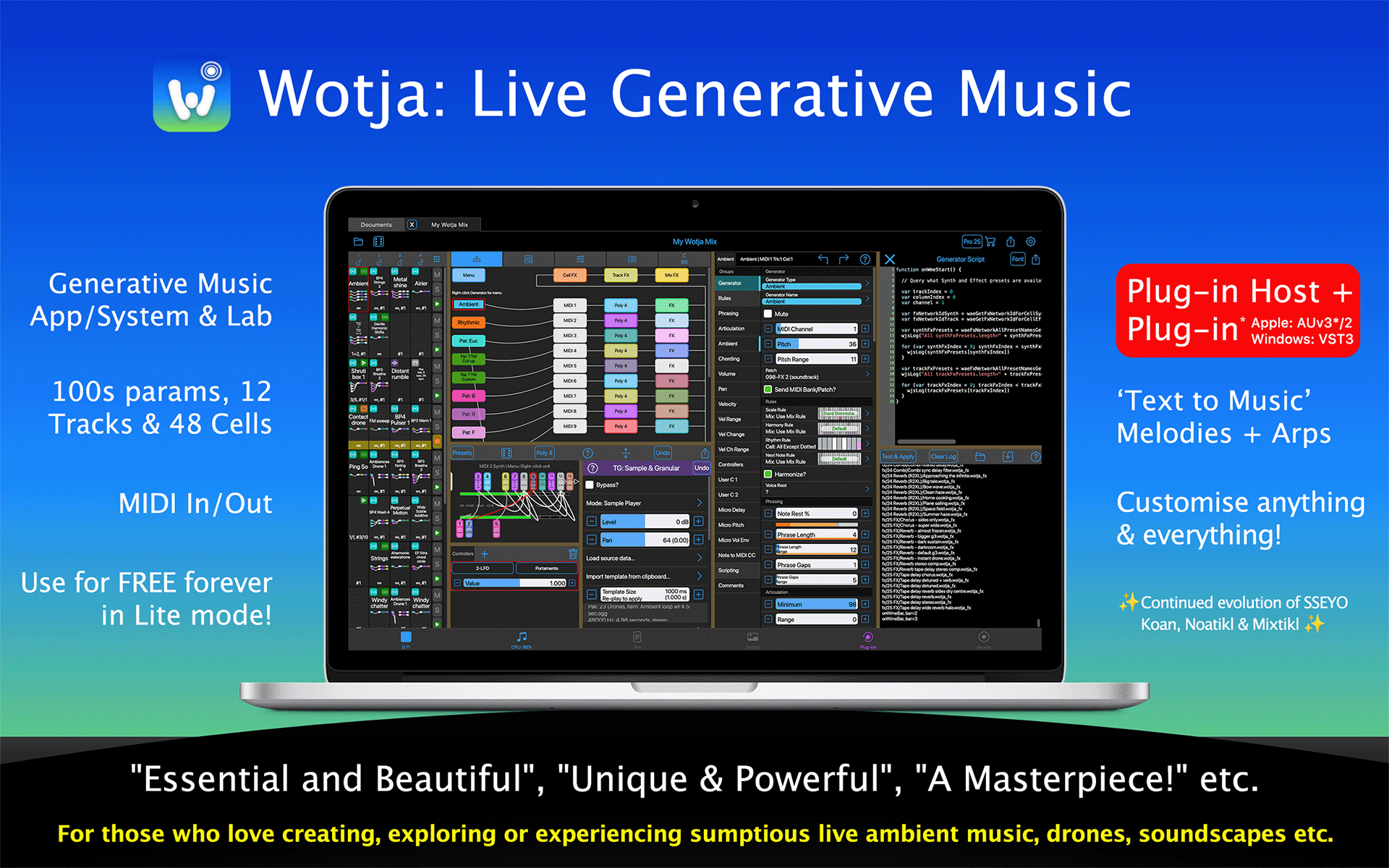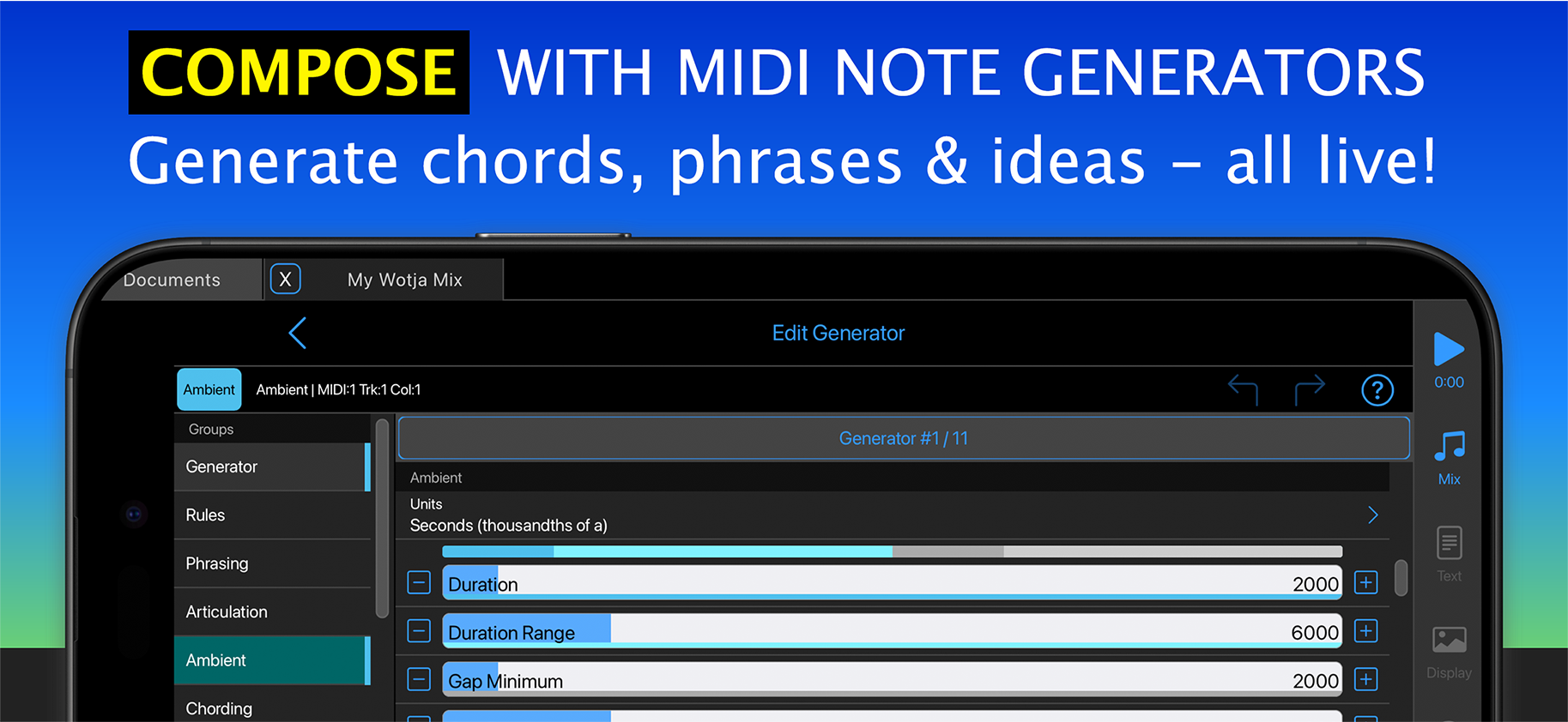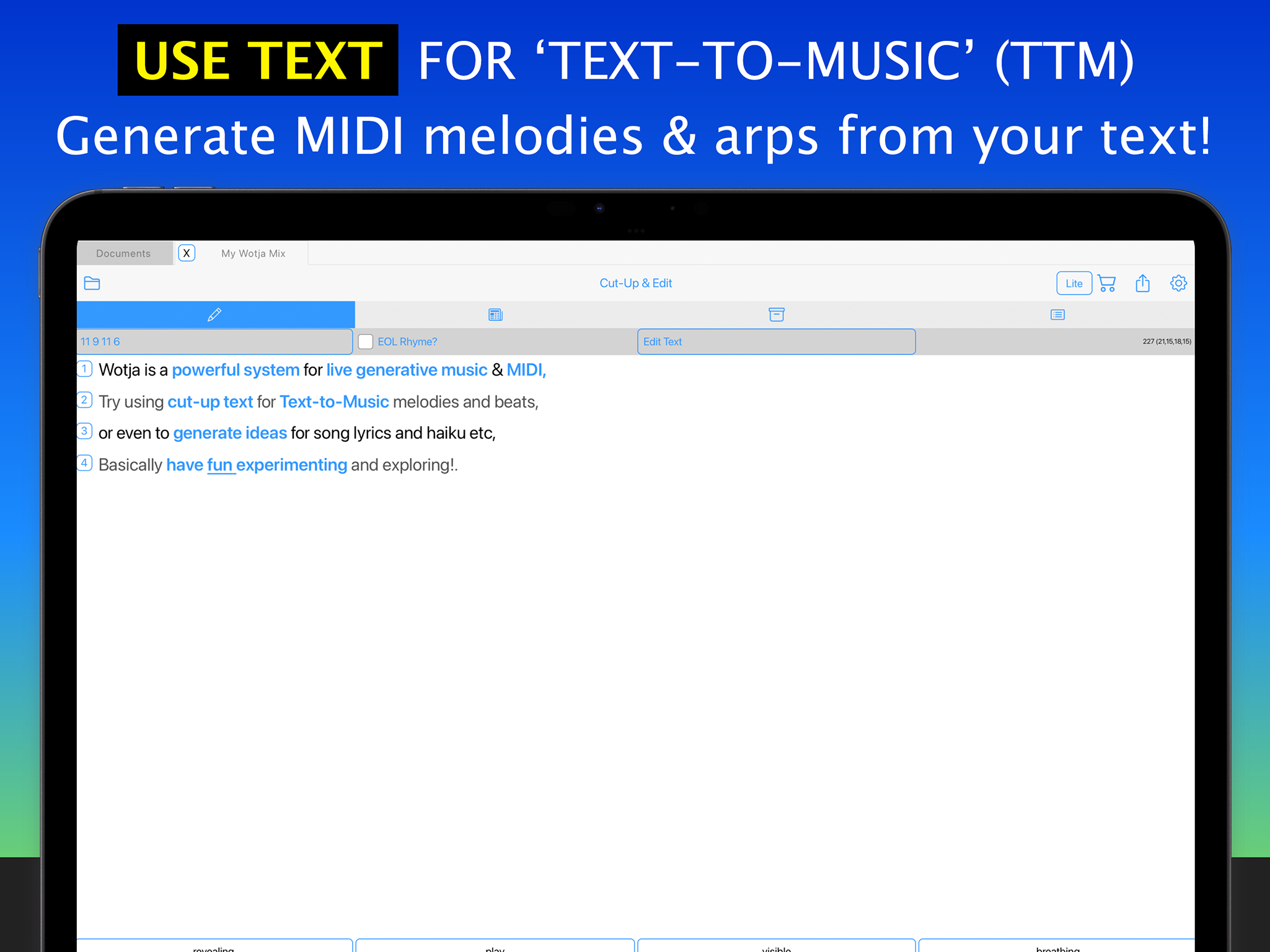 Use it to easily create & play on-device generated ambient music soundscapes, textured drones, text to music melodies & arps, experimental & adaptive music + music for sleep, relaxation & reflection. It's great for ideas, too!