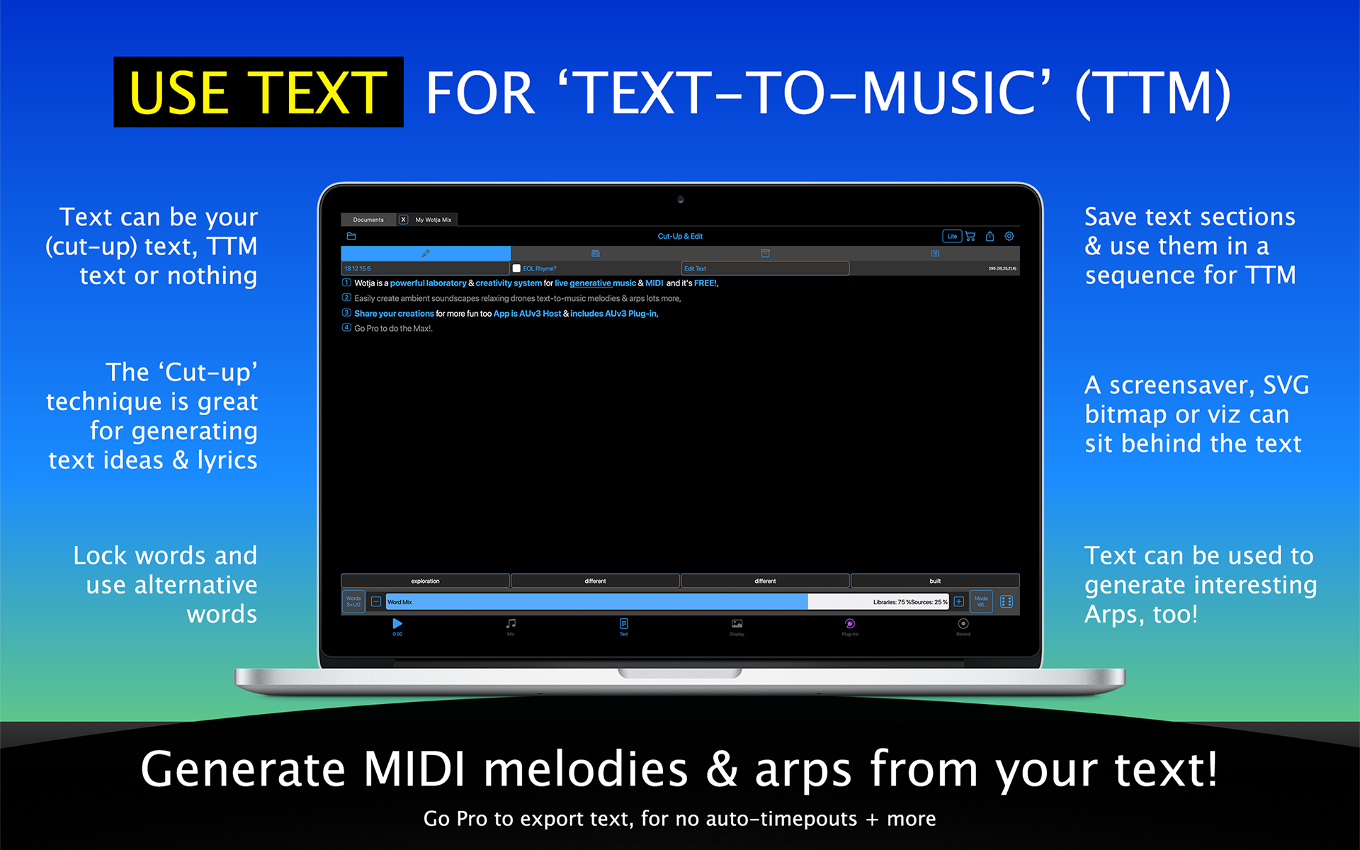 The Wotja Text Engine is our powerful cut-up text engine. It quickly generates a random cut-up from a word pool comprised of up to 5 user entered text fields as well as words blended in from an optional User Library and a user editable Wotja Word Bank.