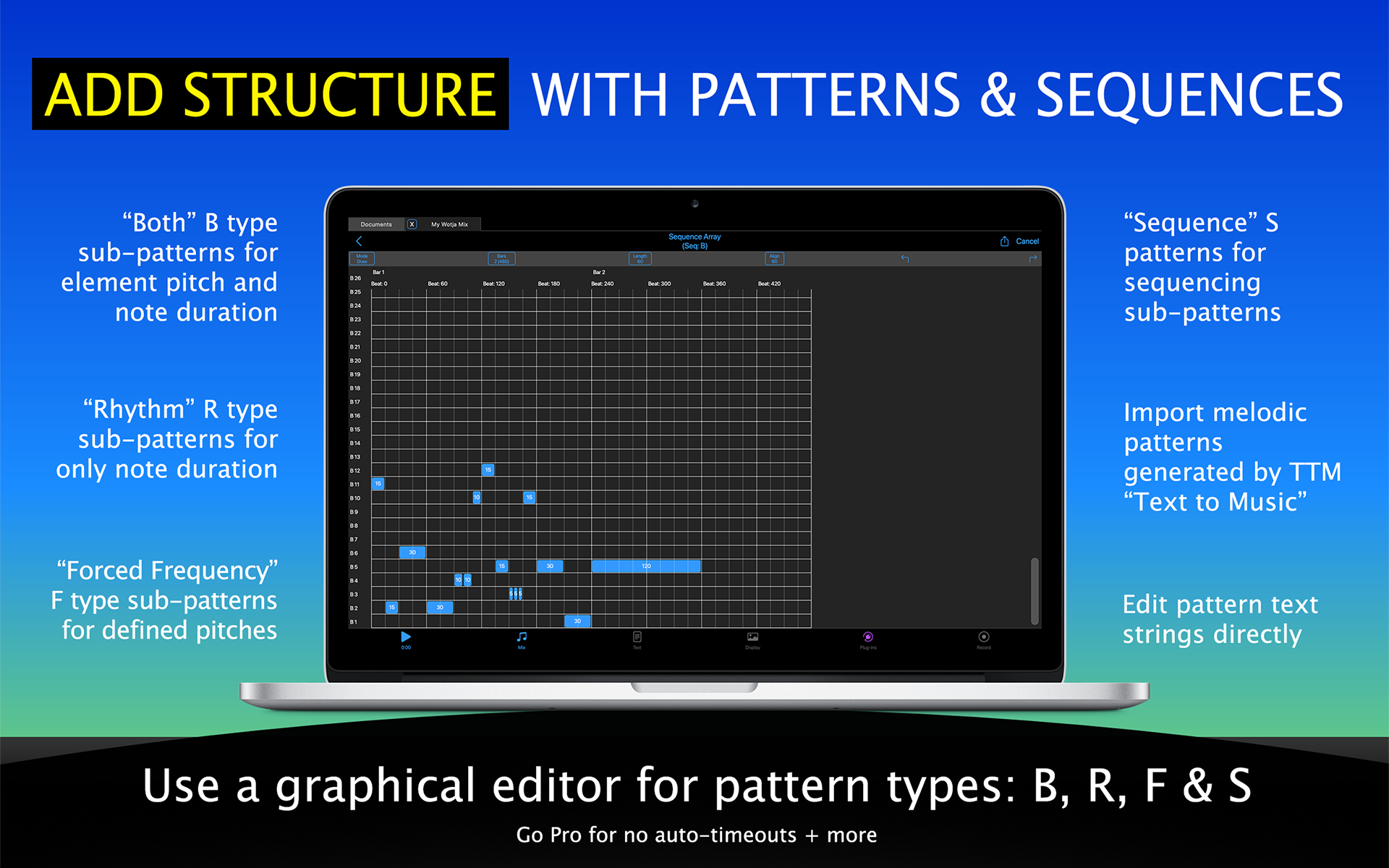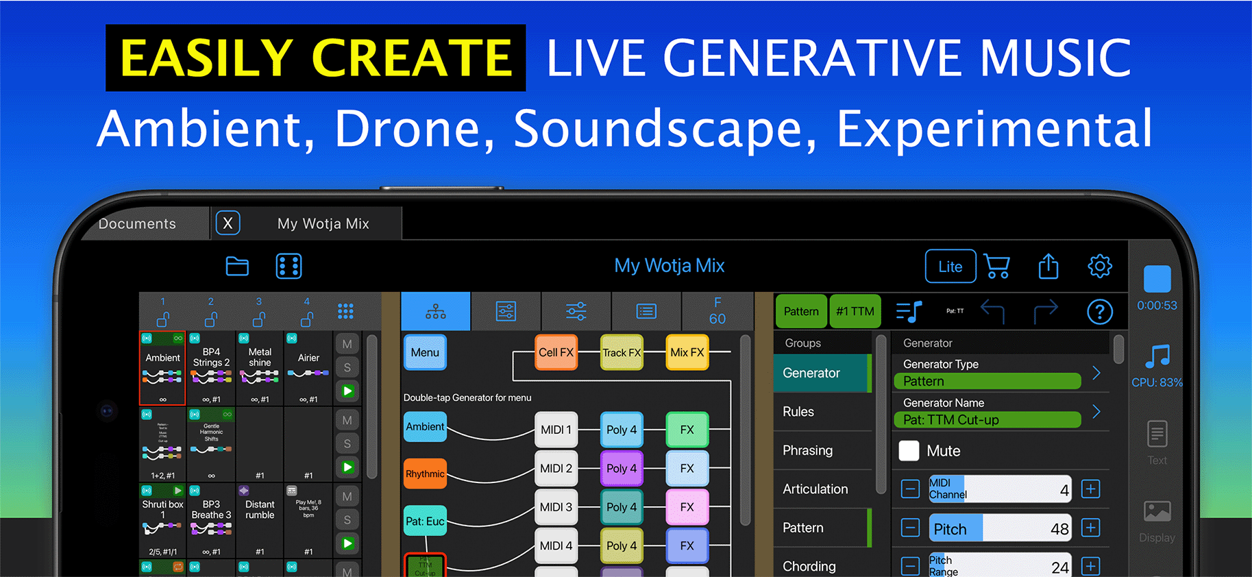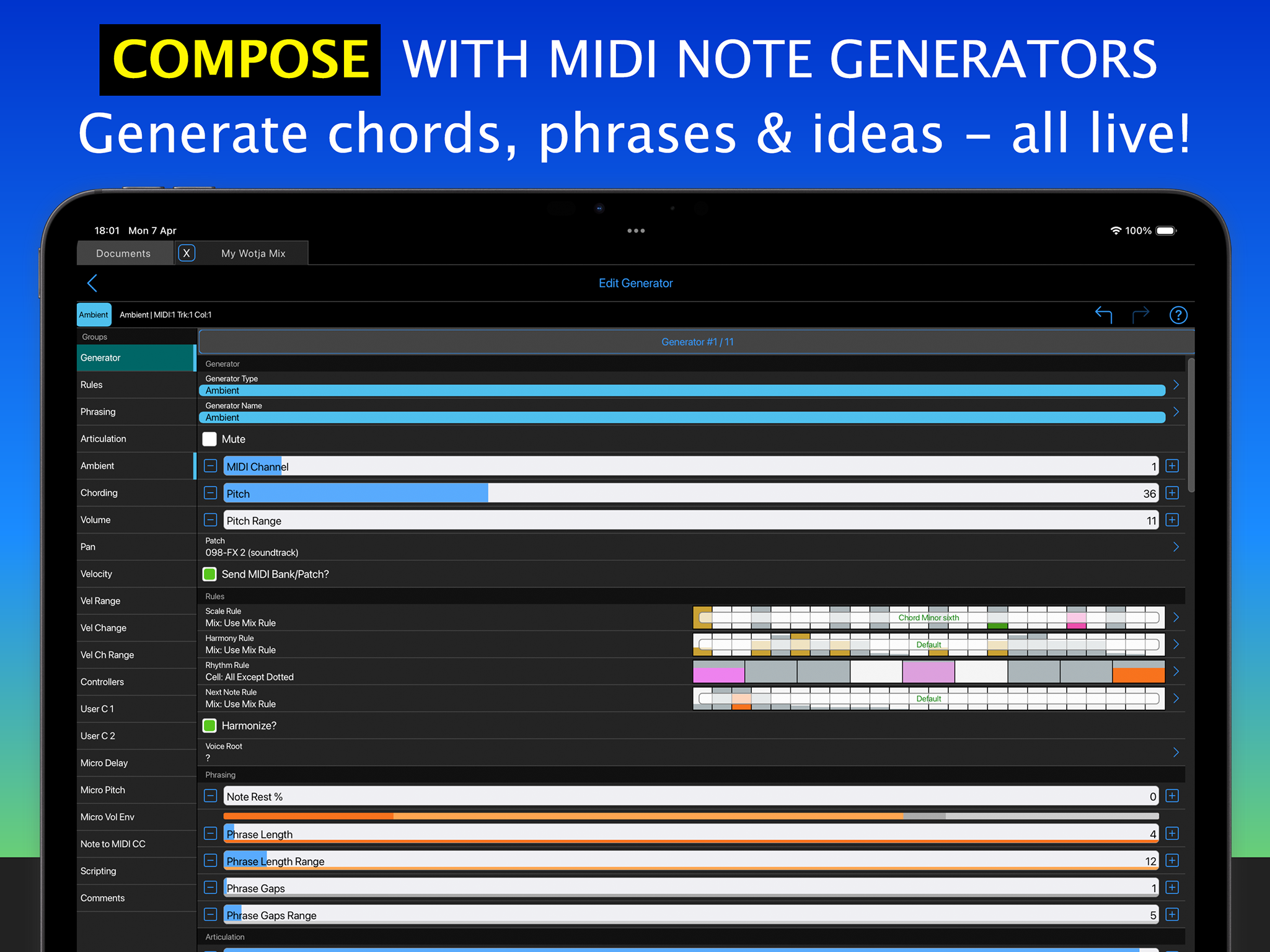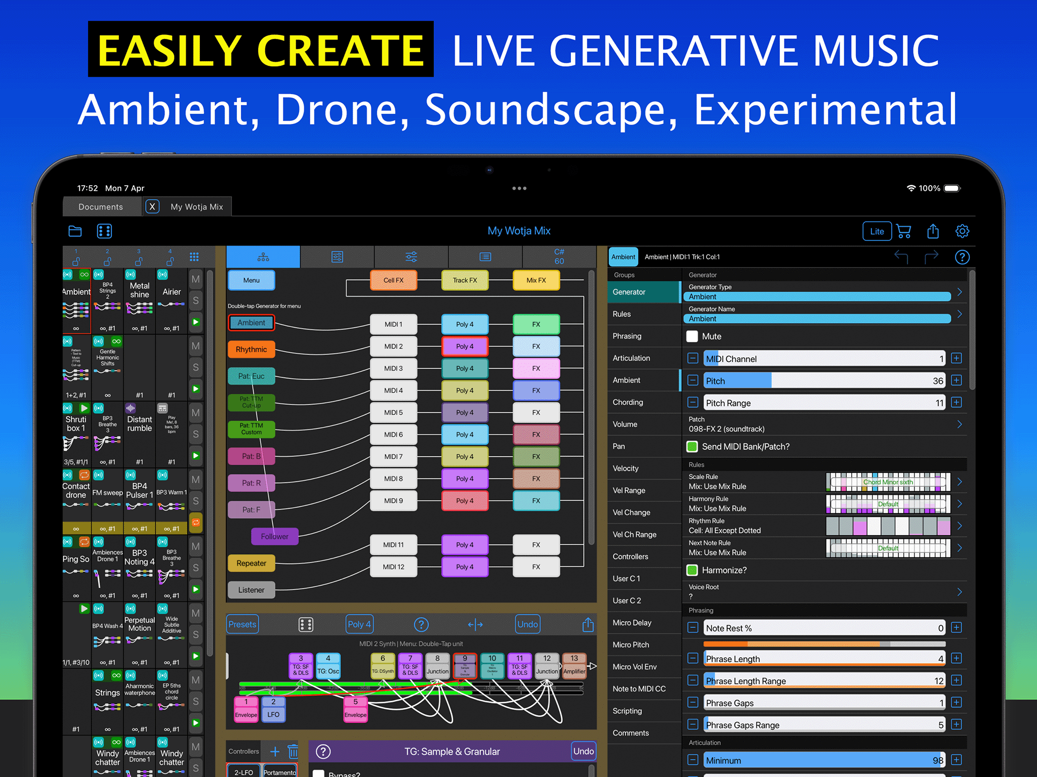 You can also use as broad a sound palette as you like because the Wotja Music Engine generates MIDI. This can be rendered via the Wotja Audio Engine and/or used (via MIDI out) to drive other 3rd Party sound units, e.g. AUv3/AUv2 or VST3 Plug-ins etc.