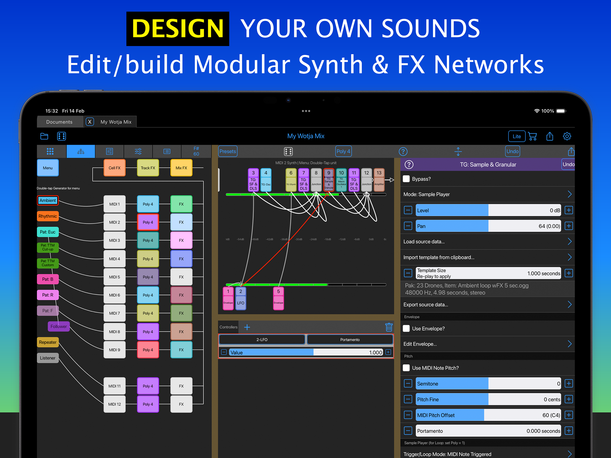The Wotja Audio Engine is a MIDI-driven sound engine that comprises a framework of sound synthesis and fx technologies with associated design interfaces. It goes beyond the traditional limitations of MIDI as it supports control of a number of essential synth & fx units including Reverb, Delay etc.