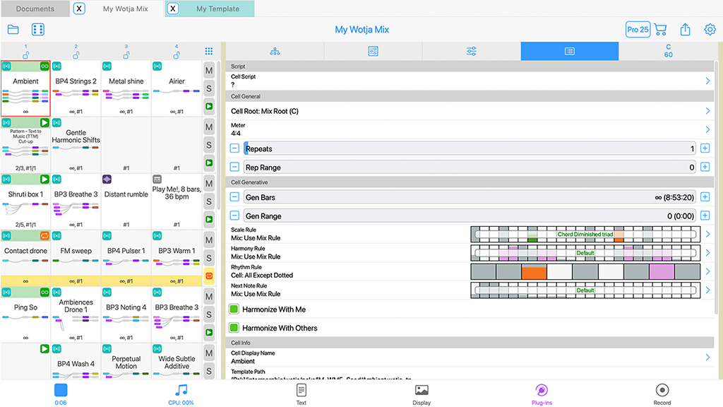 - Each Cell can have a Template added to or merged into it, OR have links to a WAV, OGG or MIDI file in a Pak.
