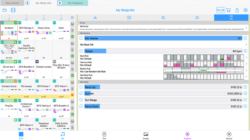 The 'magic' in Wotja, with its powerful engines (music, audio & script), largely results from how we use 'chance' and randomization techniques (with Schemas) in combining 100s of included editable Templates (these are the real key to Wotja) - and you can create/use your own Schemas and Templates, too.