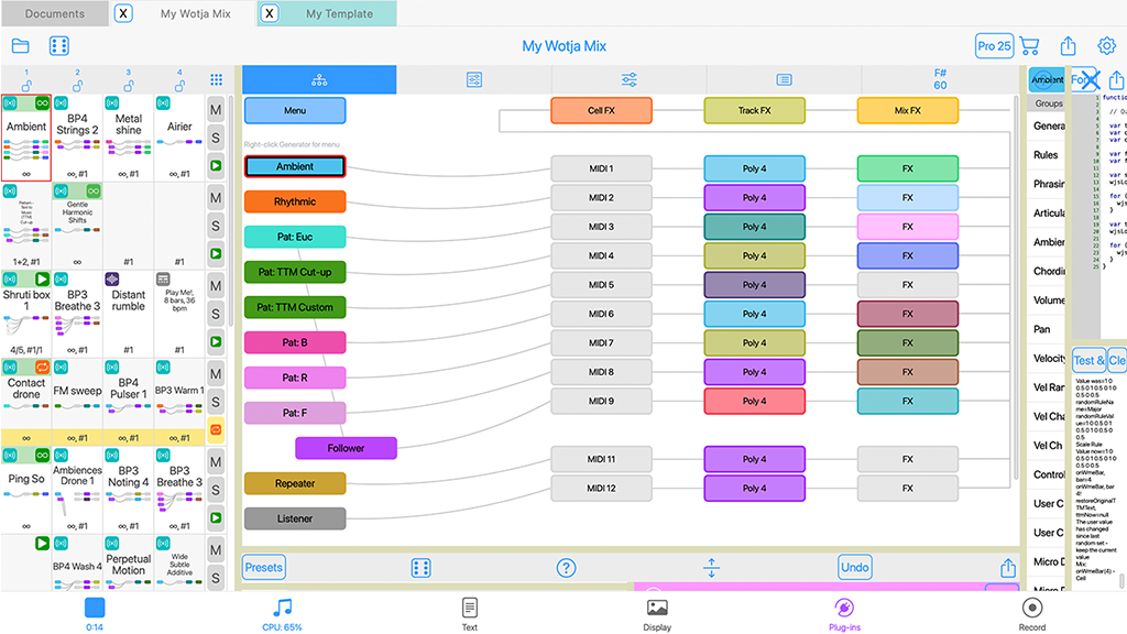 - Each Wotja Template also includes a Wotja Audio Engine (WAE) Synth & FX Network for each Generator, this being used to generate audio from that Generator's MIDI notes/events (use of the WAE is optional, and it can be turned off).